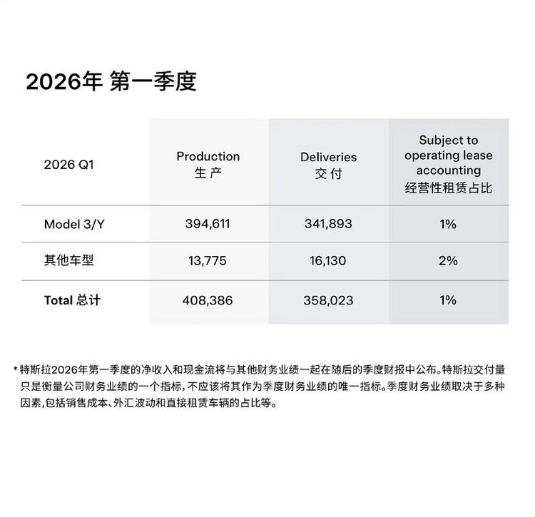 日前,特斯拉官方公布了2026年第一季度与3月份销量数据。从2026年第一季度整体交付数据来看,特斯拉全球累计交付新车358023台,其中Model 3与Model Y合计交付341893台,占据主要比例。这样的结构意味着品牌当前销量仍然集中在中型轿车与中型SUV两条产品线。从产品节奏角度看,Model 3承担走量与技术普及角色,Model Y则在空间与使用场景上覆盖家庭用户,两者形成稳定组合,支撑季度交付规模。结合历史节奏,这种双车结构在不同市场具备复制能力,也是当前全球交付稳定的重要基础。