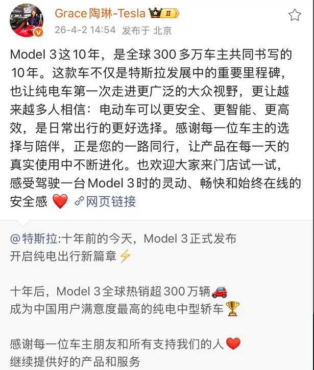 2026年是Model 3发布十周年,该车型全球累计销量已超过300万辆。从产品生命周期来看,Model 3经历多轮迭代,在设计、续航与智能化方面持续调整,逐步覆盖更广泛用户群体。对于电动车市场而言,这一车型在早期承担了规模化普及角色,使纯电动出行从小众选择转向主流消费选项。