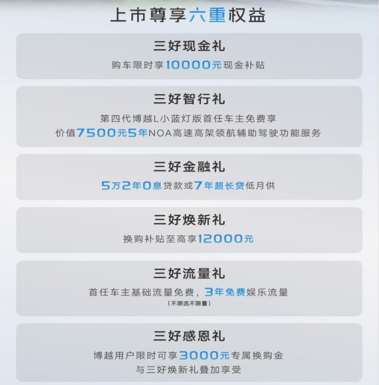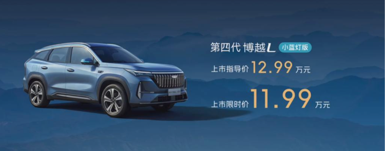 4月3日第四代博越L小蓝灯版正式上市,限时价11.99万元。相比第四代博越L原有1.5T顶配车型,购车成本增加3千元。到4月30日止,购车还有换购补贴12000元,博越用户换购额外叠加3千元。首任车主免费使用5年NOA功能。