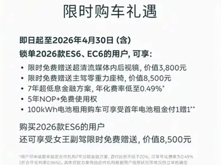综合来看,对于部分追求豪华纯电体验、且居住地换电网络较为完善的用户,2026款ES6会是一个成熟且稳妥的选择。若所在城市换电站覆盖不足,且对智能驾驶非刚需,那我认为同价位的增程或纯电车型可能会更适合日常使用。总之,没有十全十美的车,有的只是适合你的车型,也希望今天的这番分析能对你的购车有所帮助。(文/优视汽车 大卓 )