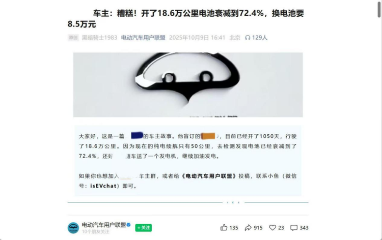 还有一位增程车主晒出账单,使用了 1050 天、18.6 万公里后发现纯电续航衰减,车辆经检测后需要更换电池。