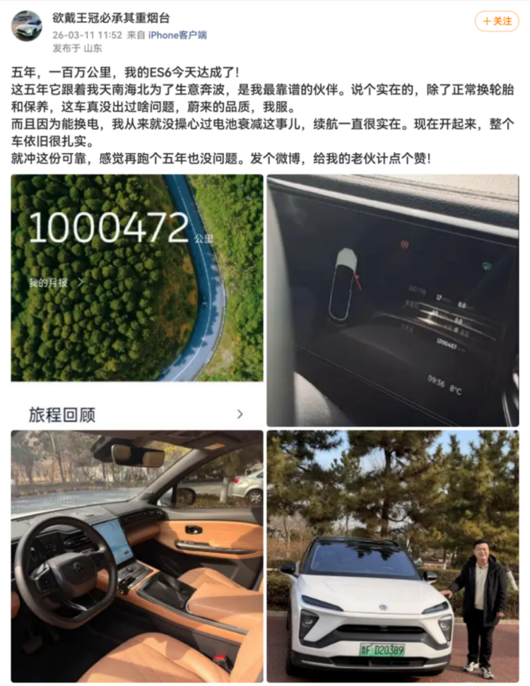 这位车主在网上晒出了自己的初代 ES6,表示在过去五年内,这台车的累计行驶里程超百万公里,期间除了正常换轮胎和保养,没出现过任何问题。