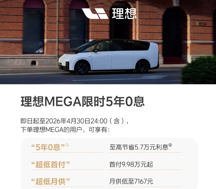 理想MEGA、理想i6就开始进入促销,其中理想MEGA可以选择首付9.98万元5年0息,但是月供高达7167元!一般用户是比较难承担得起的;或选择7年超低月供方案,可享前5年0息,月供低至5119元,支持提前还款。