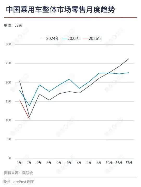 但根据乘联会数据,2026 年 1-2 月国内乘用车零售销量呈现持续下滑趋势。1 月同比下滑 13.9%,2 月受春节假期影响下滑幅度扩大至 25.4%。这一轮下滑行情始于 2025 年 10 月,至今已持续 5 个月。这是自疫情后,“购置税政策”、“国补”、“省补”、“厂商补贴” 等各类补贴政策实施以来,国内乘用车市场首次出现连续 5 个月的下行周期。