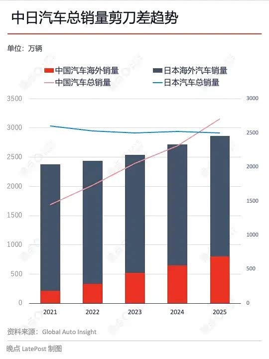 海外咨询机构 Global Auto Insight 在 2026 年 1 月发布的数据显示,2025 年中国车企全球累计销量达近 2700 万辆,首次反超日本车企的约 2500 万辆 。这也是中国首次在销量上反超日本。