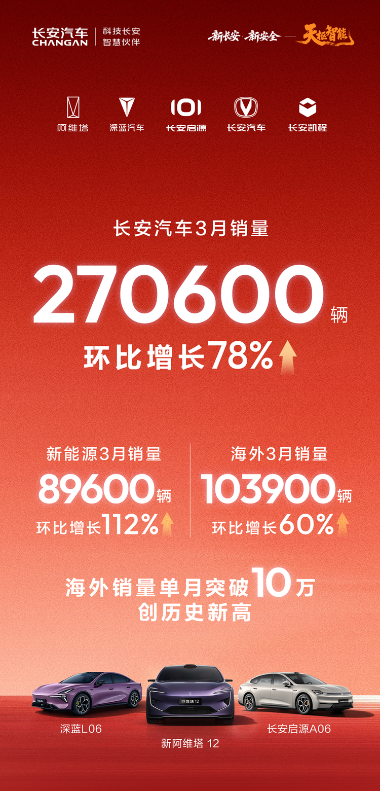 在刚刚过去的3月,用户用真金白银给出了答案。3月长安销量强势上扬,交出硬核成绩单:集团整体销量27.06万辆,环比增长78%;新能源销量8.96万辆,环比大增112%;海外销量首次单月突破10万辆,达10.39万辆,环比增长60%,创历史新高。