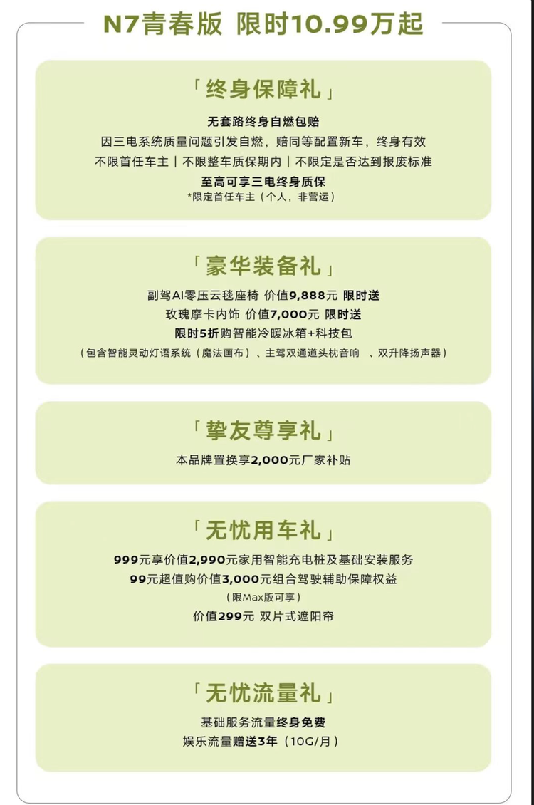 综上所述,N7青春版的“降价不减配”是一次对纯电市场价值体系的重塑。它证明了“青春版”不等于“乞丐版”,在10万级这一竞争最激烈的红海市场,唯有坚持核心品质不减、真诚对待用户需求,才能赢得消费者的真正认可。