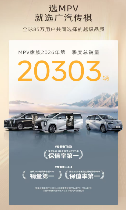 围绕用户用车痛点,广汽传祺打造了覆盖购车、用车、保值全周期的价值体系。据中国汽车流通协会与精真估联合发布的《2025年度中国汽车保值率报告》,广汽传祺位列自主品牌三年保值率榜首,旗下GS8、M8、E8分别登顶对应细分市场保值率第一。