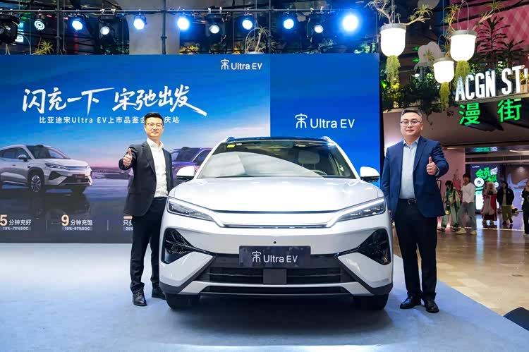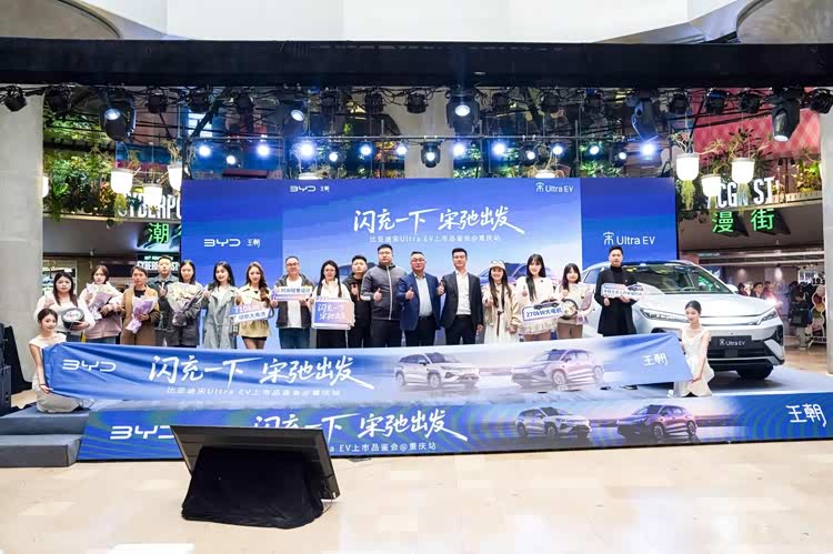 3月28日下午,重庆观音桥方圆LIVE,一场新车发布挤满了人——比亚迪 宋Ultra EV(参数|询价)重庆区域上市品鉴会。现场赛博朋克风霓虹灯、二次元打卡墙中间,停着几台火岩灰、烟岚紫配色的纯电SUV。车15.19万起,顶配17.99万。但真正让围观群众掏出手机狂拍的,是一台车从10%电量开始充电,5分钟跳到72%。有人喊:“这比加油还快!”