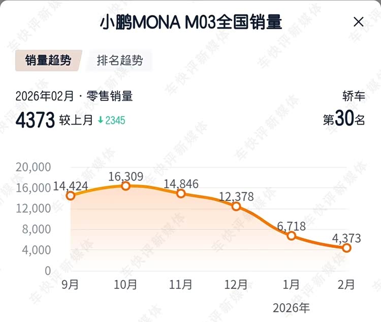 虽然目前小鹏MONA M03在国内紧凑级纯电轿车市场,销量稳居第一。但是查了一下数据,自去年10月至今小鹏MONA M03已经出现了4连降。在今年1月和2月连续两个月,小鹏MONA M03单月销量都跌至万辆以下,2月销量更是跌至5000辆以下创下了小鹏MONA M03上市整月的销量新低。
