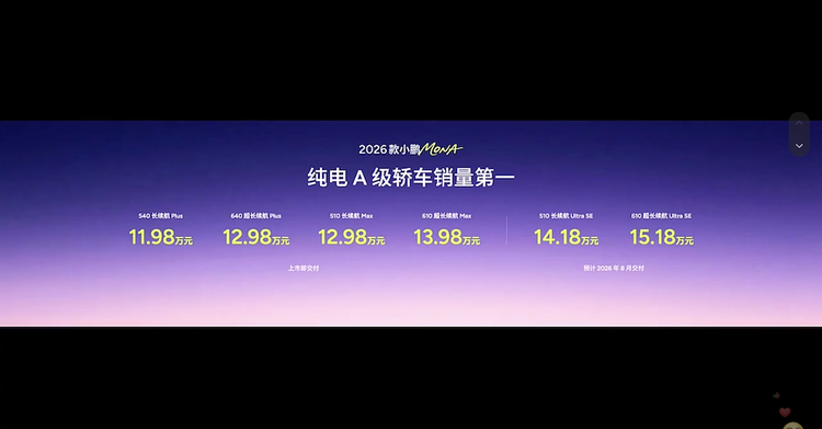 第二个问题上,小鹏2026款的MONA实际上比2025款的利润好非常多。它体现了小鹏的一个非常重要的能力,就是车是越来越好,而且我们追求越来越高的毛利。