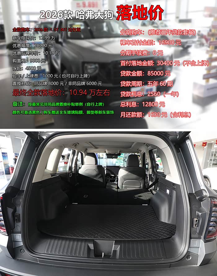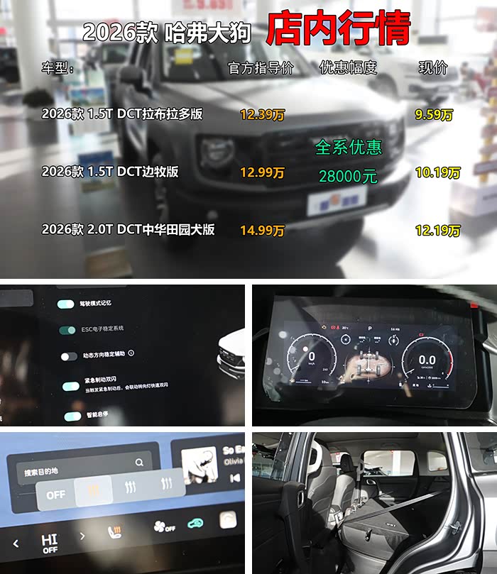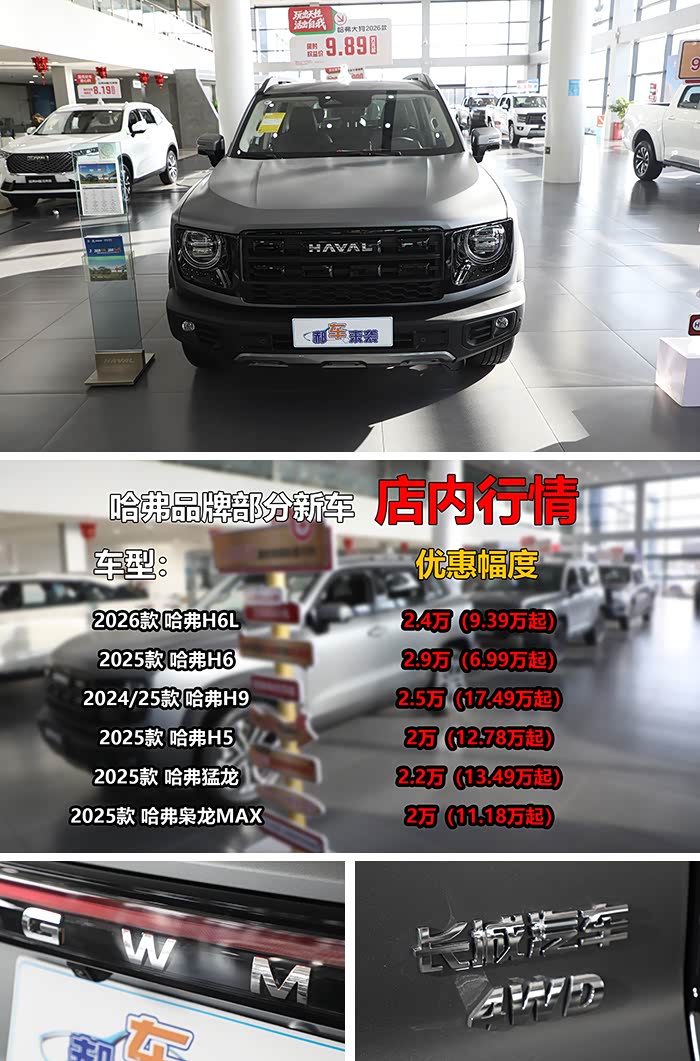《郝车来袭》总结:相信通过郝哥的介绍,您对2026款哈弗大狗也有了更深入了解,以上所有数据均为郝哥粗略估算,仅供您购车时预算参考。此外,郝哥还通过店内了解到,哈弗旗下其它新车也均有不同程度优惠,例如2026款哈弗H6L优惠2.4万元,优惠后起步价9.39万元。曾经的经典力作哈弗H6直降2.9万元,包括经典版和国潮版,优惠后仅售6.99万起,哈弗的旗舰级SUV哈弗H9则让利2.5万,售价17.49万起,同时哈弗猛龙也可优惠2.2万元(13.49万起);最后,还有哈弗H5和哈弗枭龙MAX售价均下调2万元等等,不知道以上有没有您心动的车型呢?感谢您关注《郝车来袭》。