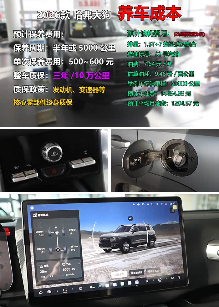 养车成本方面,新车保养周期为5000公里或半年,单次保养费用为500~600元上下,值得一提的是,2026款哈弗大狗还支持发动机、变速器等核心零部件终身质保。至于油耗,郝哥同样以推荐配置为例,新车工信部综合油耗显示为7.46升/百公里,为了更接近真实,郝哥以再增加两个油计算,也就是9.46升,目前北京地区92号汽油的油价为7.64元/升,假如每年行驶20000公里,那么预计您的年油费为14454.88元,平均月油费为1204.57元,不知道这样的油耗水平您还满意么?