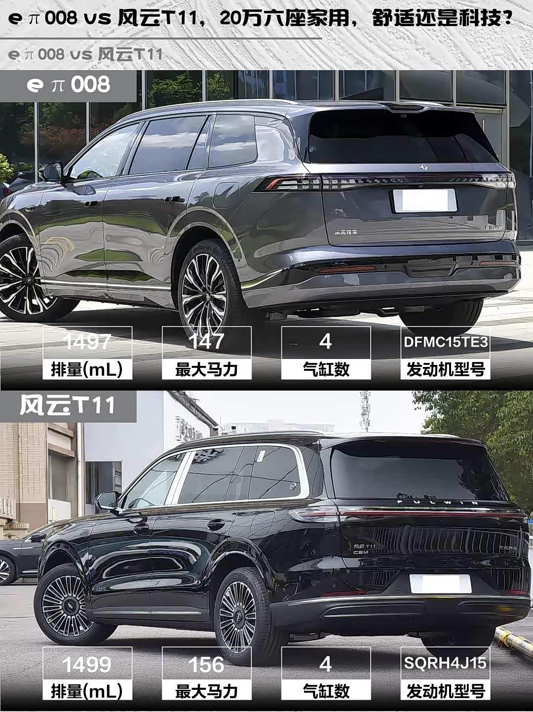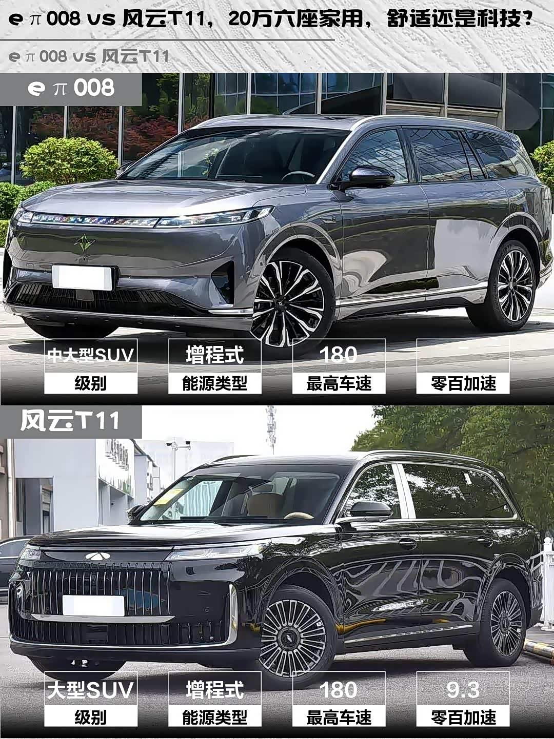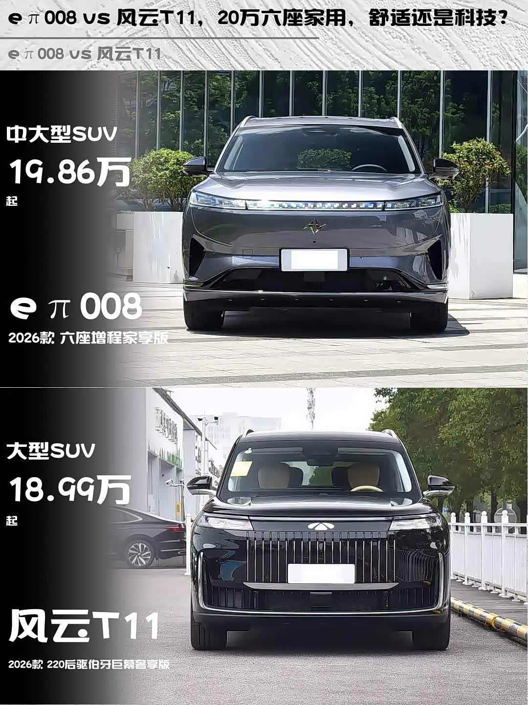 最近在选家用六座SUV的朋友看过来!今天深度对比两款20万级热门选手——eπ008 2026款六座增程家享版和 风云T11(参数|询价) 2026款220后驱伯牙巨幕奢享版,实测干货奉上👊