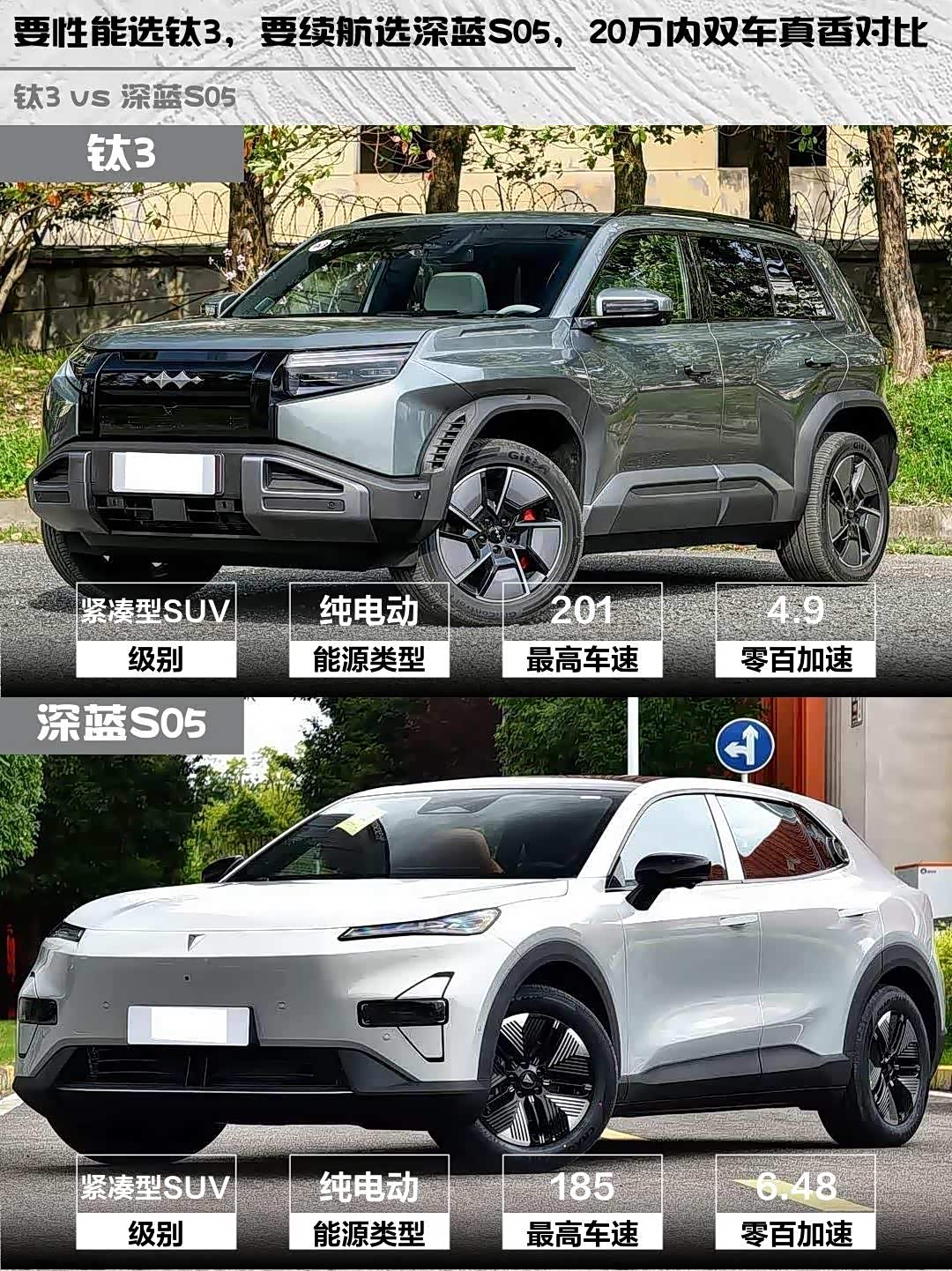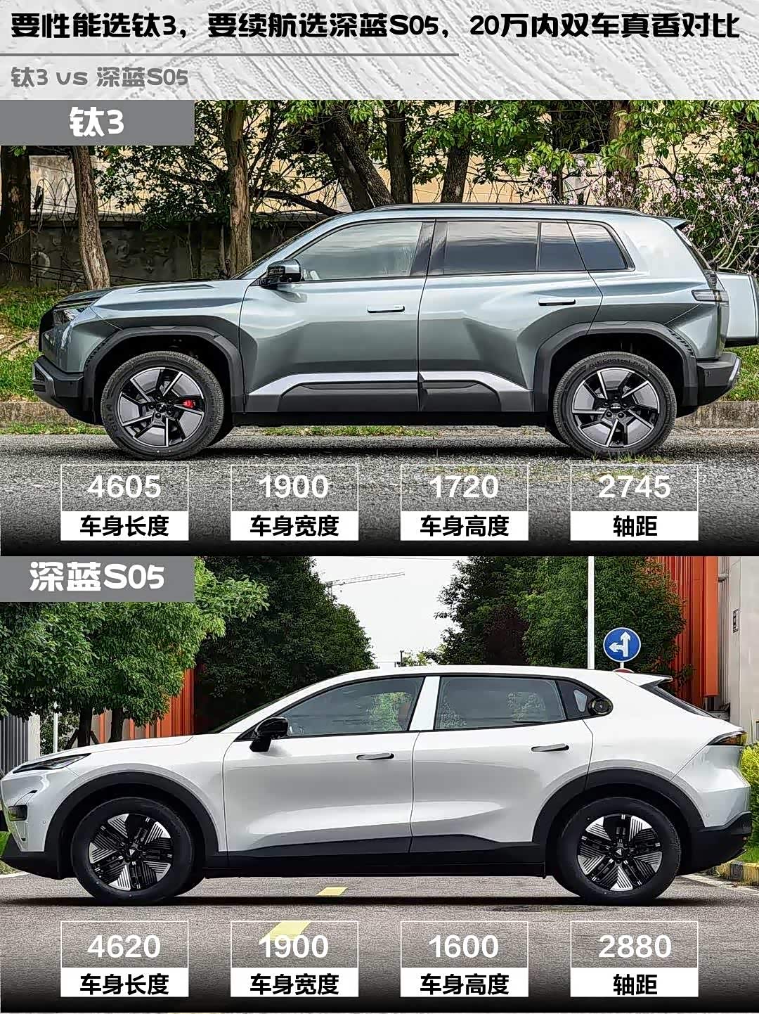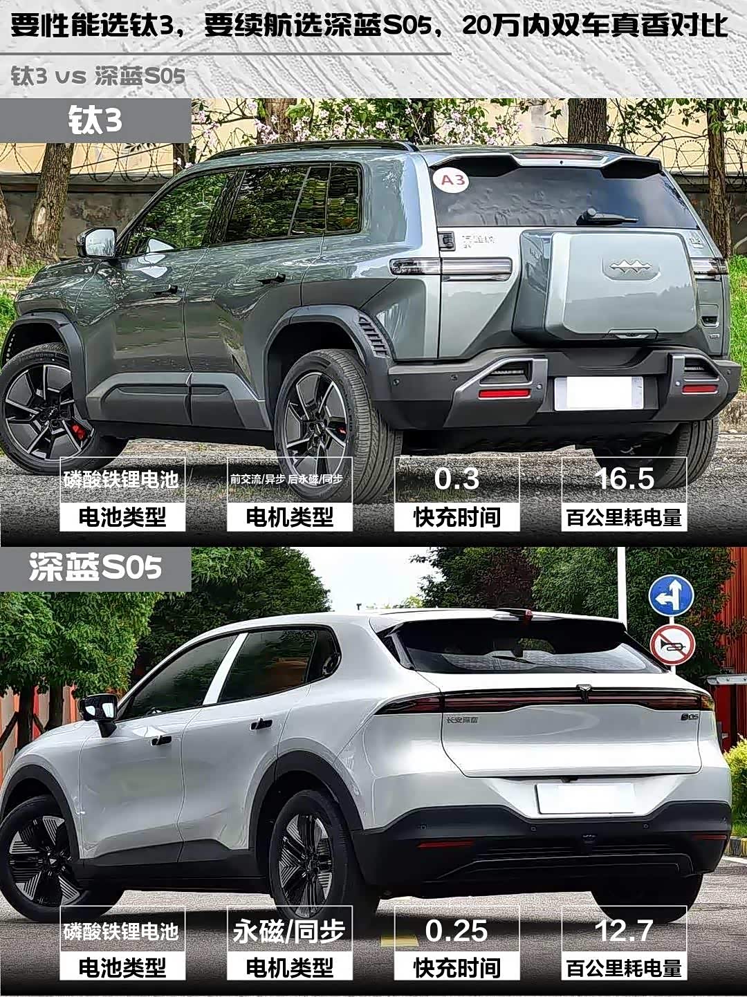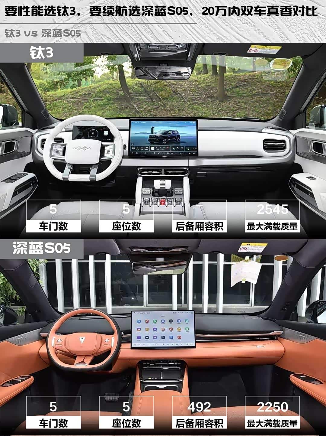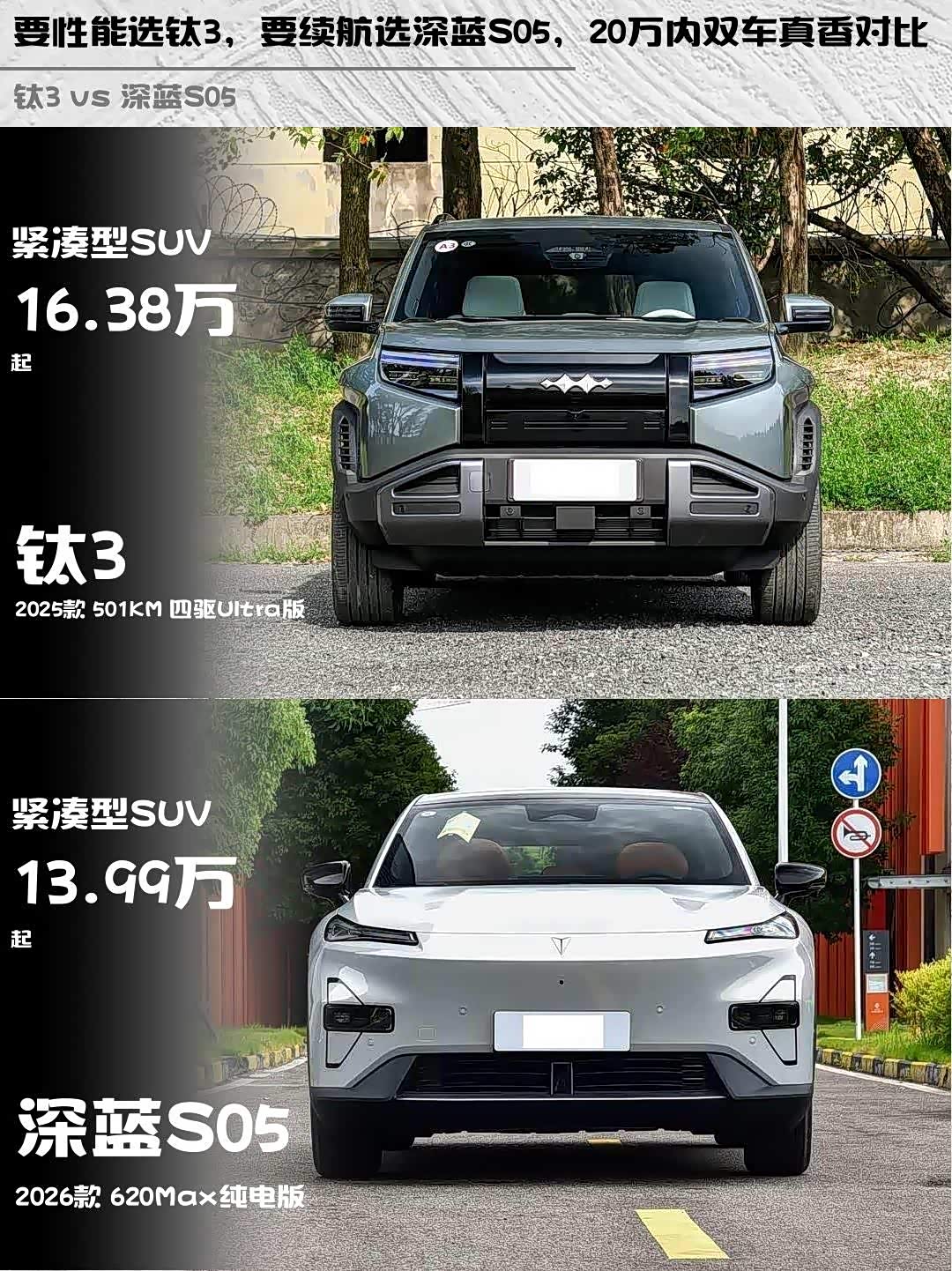 方程豹钛3 2025款 501KM四驱Ultra版 vs 深蓝S05(参数|询价) 2026款 620Max纯电版,这两台20万内的纯电SUV到底怎么选?作为深度试驾过两台车的“老司机”,掏心窝子分享真实体验👇
