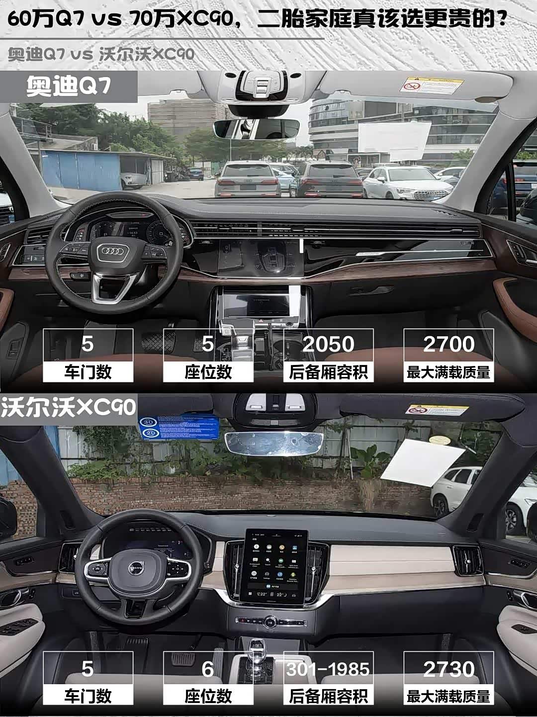 Q7后备箱常态740L,放倒座椅直接变2050L搬家神器!但前排储物空间少得可怜,手机无线充电位藏得太深🔍。XC90的6座布局超实用,第二排独立座椅+第三排能坐成年人,后备箱301-1985L灵活多变,就是满载时后备箱稍小。