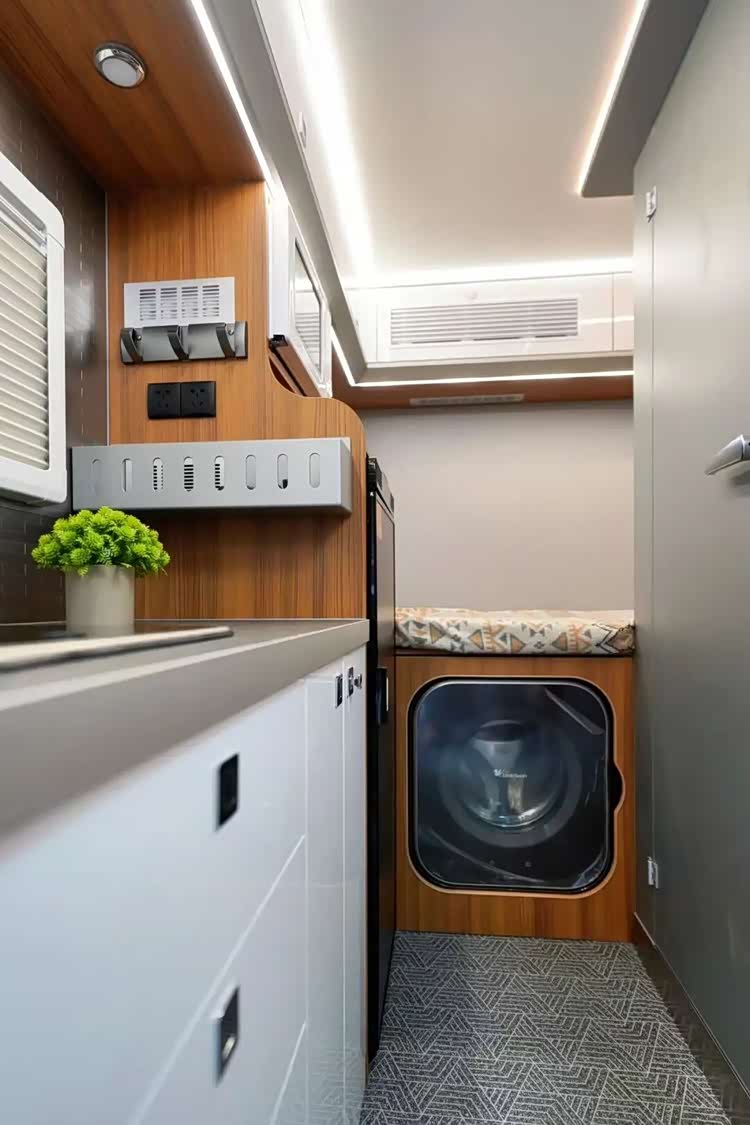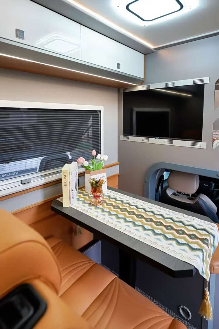 车内生活区布局合理,功能分区明确。会客区采用“类似”对卡座设计,正向一侧为双人汽车座椅,保障乘坐舒适与安全;背向一侧为不带靠背的长条沙发,在需要时可容纳3人,会客区最多可坐下5人。会客区前方与额头床隔断处设有一台电视,为长途旅行提供娱乐支持。背向长条沙发还可作为上额头床的阶梯凳,方便不同年龄段用户使用。