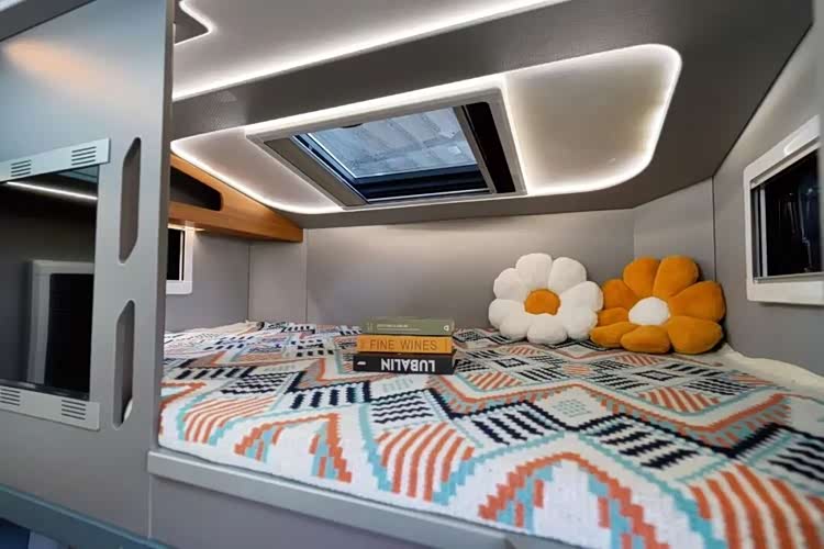 车内设计两张固定床铺,额头床采用半封闭设计,通过会客区前方的电视机墙进行半分割,空间更隐私、更有安全感。搭配隐私帘后,如同加大的睡眠舱,面积大、头顶空间高,且几面都有窗户,采光通风良好。车尾床铺为单人床设计,一侧有带隐私窗的窗户,阳光与隐私可随心变换。车尾增加的单人床为三人出行提供便利,符合途酷“让更多人享受舒适房车生活”的品牌理念。