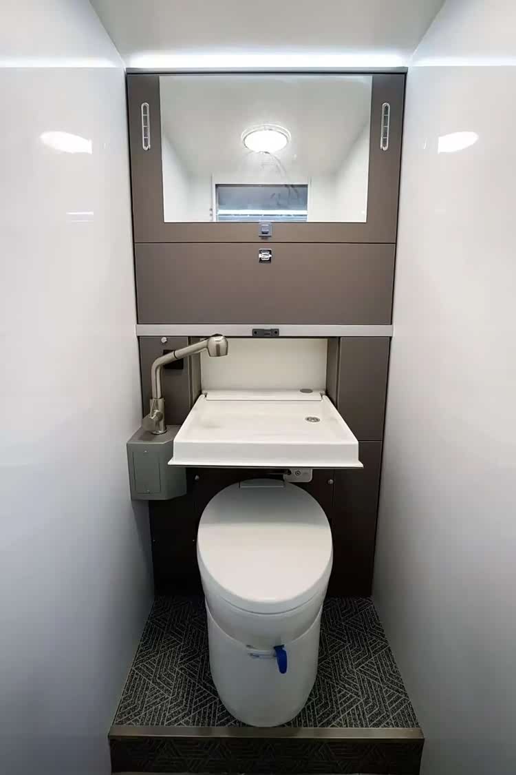卫生间位于后置床与会客区之间,空间格局方正,利用率高,使用起来更加舒适。卫生间内配有可旋转马桶、伸缩花洒等基本设施,侧边墙壁设计有镜子,背后是隐藏式储物空间,可存放洗护产品和洗漱牙杯等。镜子下方是可翻折的洗手池,不使用时翻折起来可极大节约卫生间空间。