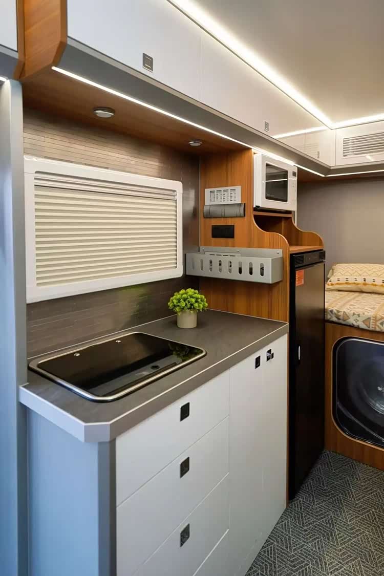 厨房区域设计在进门一侧,在皮卡房车中空间较大。台面上方配有带盖洗菜池,剩余台面面积充足,切配操作方便。烹饪部分配备室内(移动)电磁炉,下方储物空间丰富,满足各种厨房用品的存放需求。靠墙窗户装有侧排式排气扇,保证厨房空气清新。厨房操作台面侧边设有小吧台,下方配有房车专用冰箱,顶部除储物空间外下方是一台美的品牌微波炉,为烹饪提供更多便利。
