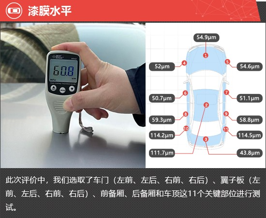 在漆膜水平测试环节,通过测试结果可以发现,整车漆膜平均厚度约为69.6μm,在测试过的同级别车型中处于下游水平。从各关键部位的测试数据来看,仅左右后翼子板和车顶的漆膜厚度超过110μm,而后备厢的漆膜厚度只有43.8μm,整体漆膜厚度与漆面喷涂均匀性均表现不佳。