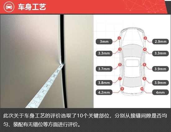 在车身工艺测试环节,整车共选取10个关键部位,每个关键部位都会选取3个关键点进行测量,以评价各关键部位缝隙的均匀程度。从测试结果来看,评测车全车绝大多数部位的缝隙均值处于合理范围内,但左右后翼子板与后备厢连接处缝隙均值略高,对最终测试成绩造成一定影响。