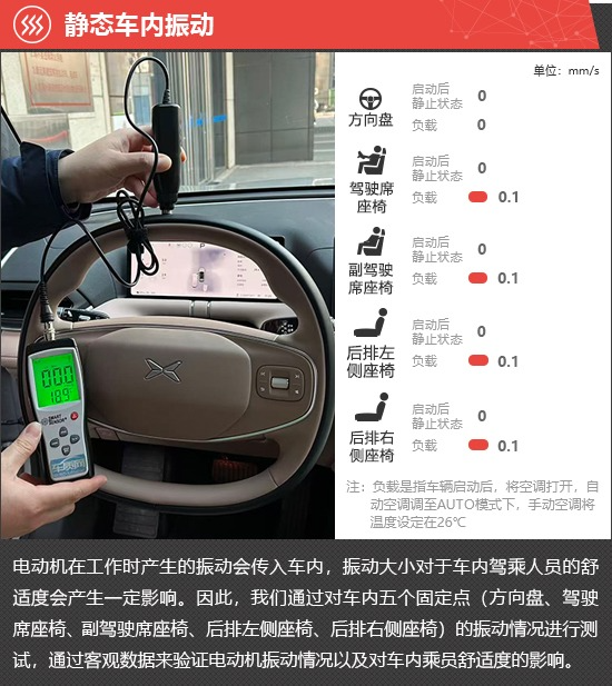 在静态车内振动测试环节,启动后静止和负载两种状态下,评测车方向盘位置的振动数值始终为0,前后排座椅的振动数值虽然在负载状态下略有提高,但对乘坐舒适性未造成影响。