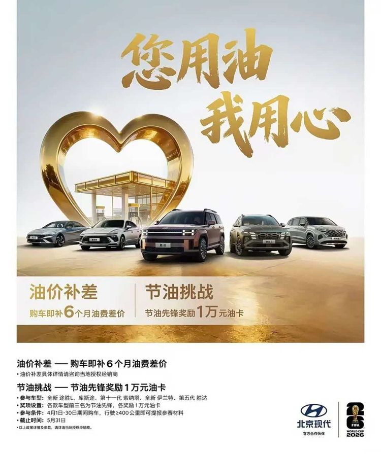 近期国内成品油价迎来多轮上调,这也让不少持币待购的消费者产生了顾虑,毕竟用车成本的增加,是很多用户购车时会考虑的重要因素。针对这一市场变化,北京现代推出了4月购车相关的福利政策,核心就是油价上涨补差价,以此缓解用户的用车焦虑。这份福利政策没有复杂的条款,也没有过多的限制,面向4月1日至30日期间购车的用户,覆盖了品牌旗下多款主力车型,让更多用户能够享受到实惠。具体来看,这项油费差价专项补贴为期6个月,补贴标准是按照每升油补贴1.4元、每次常规加油量50升、每月加2箱油的用车频次计算,用户最终可享850元的油费补差。这个补贴标准贴合了大多数用户的日常用车习惯,不是那种华而不实的福利,而是真正能够降低用户用车成本的举措。除了油费补差,活动期间购车的用户还可以参加节油先锋万元油卡挑战赛,只要在5月31日24点前,新车行驶里程达到400公里及以上,就可以参与比赛,最终每款车型的前三名还能获得1万元油卡奖励,既贴合了车型的节油特性,也为用户增添了一份额外的惊喜。