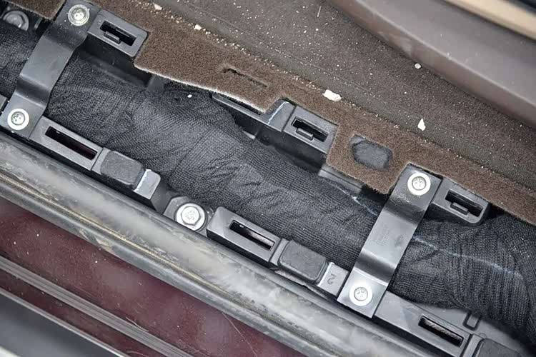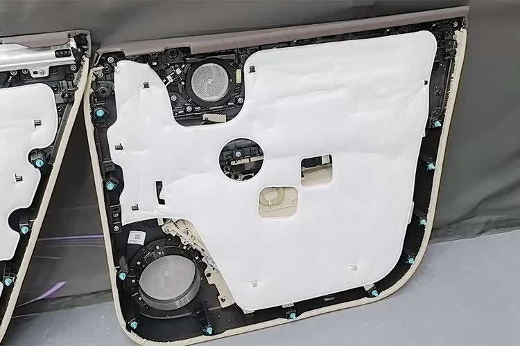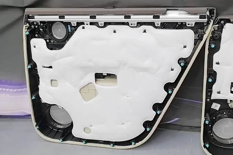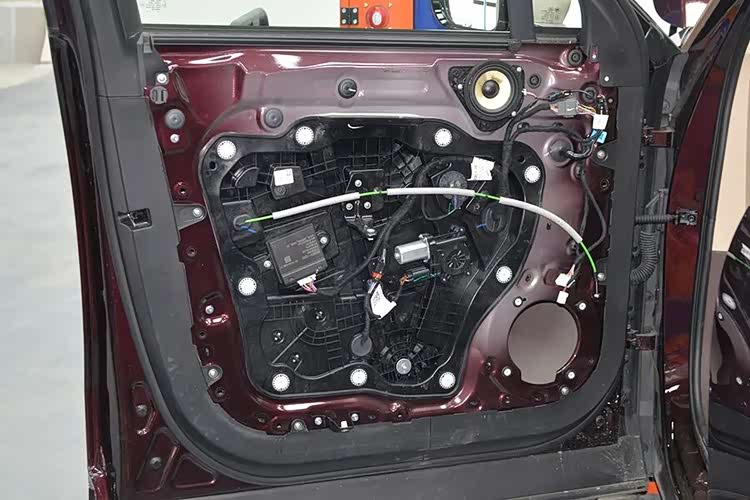 拆掉车门内饰板,能看到整个车门都是铝合金材质,硬质塑料板密封,豪华车的标准动作。