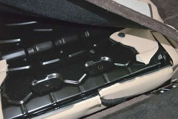 这辆车是六座车型,第三排座椅靠背有完整的保护钢板,还有喷漆防锈处理。
