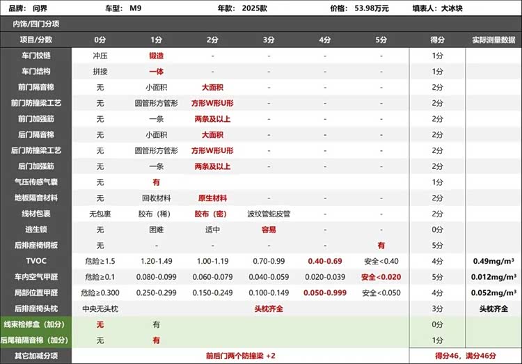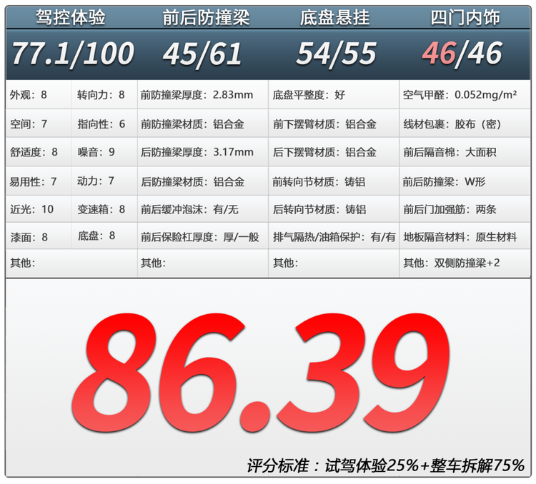 拆开之后,能看到这辆车使用了大量的铝合金部件,前后车身、底盘悬架均为铝合金材质,前后防撞梁也是铝合金,没有硬伤,失分项极少。内饰和甲醛测试环节获得满分,底盘差1分满分,总分排名第二,第一是自家的尊界S800,也就是说鸿蒙智行包揽了前两名,还“遥遥领先”第三名。难怪即便售价高达50多万,也能够成为爆款车!(本文及视频中的测量数据结论观点仅对此辆车负责,测量数据对公示的实验方法负责。)