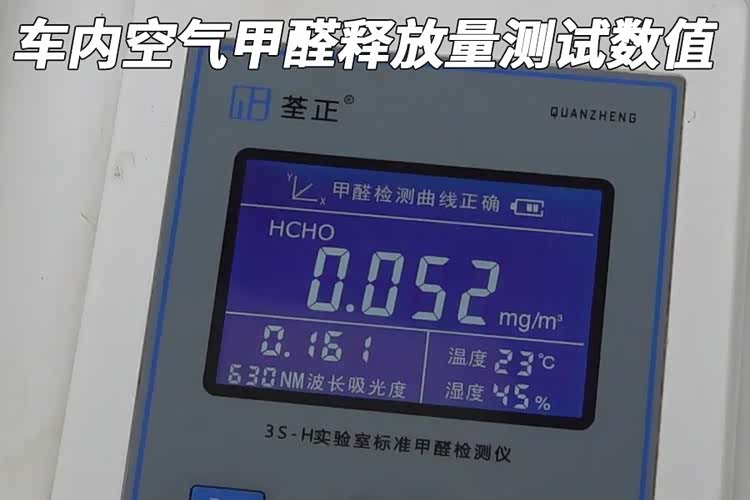 经过在23±1℃恒温环境中16小时的封闭,这辆车的车内空气甲醛释放量测量数值为0.052毫克每立方米。