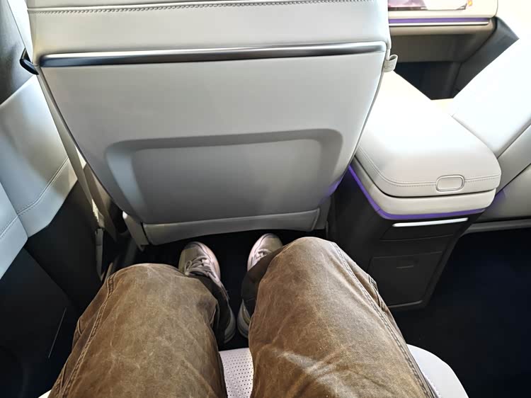 三排乘坐体验就相对比较差了,虽说侧面视野不错,但有个不小的台阶,带来了比较明显的“蹲板凳”感受;绝对空间也一般,具体表现如图。二排三排必须要互相将就才行,我的身高才170cm出头,尚且如此,个子更高的乘客就会有点麻烦了。