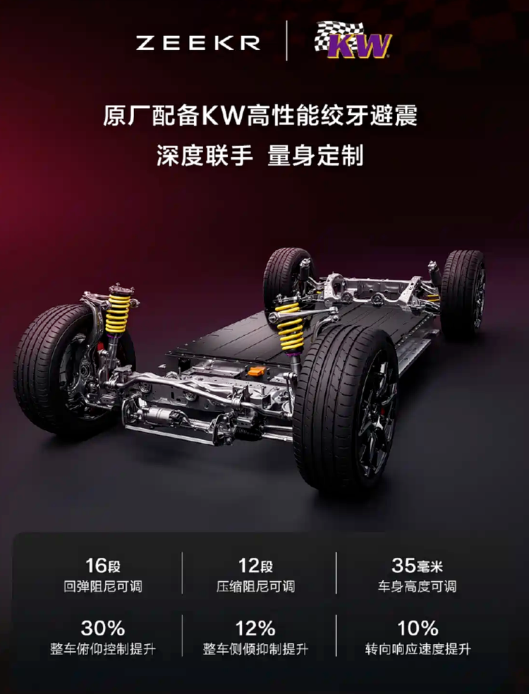 极氪与德国KW团队历时三年完成整车适配标定,依托7-POST RIG赛车级台架完成了200余项参数匹配调试,大幅提升了行驶稳定性与操控质感。动力方面,新车搭载900V纯电平台架构,配备双碳化硅四驱系统,系统峰值功率高达925马力,0-100公里/小时加速时间仅需2.91秒,最高车速可达280公里/小时。