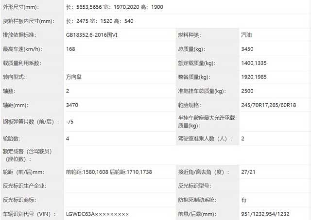 新申报车型车身尺寸有两种,长宽高分别为5653mm×1970mm×1900mm和5656mm×2020mm×1900mm,与现有车型尺寸有差别。轴距尺寸为3470mm,是一款长轴版车型。新车型的货箱尺寸长宽高为2475mm×1520mm×540mm,载重量瞬间提升,更适合需要更多载货需求的商用场景。