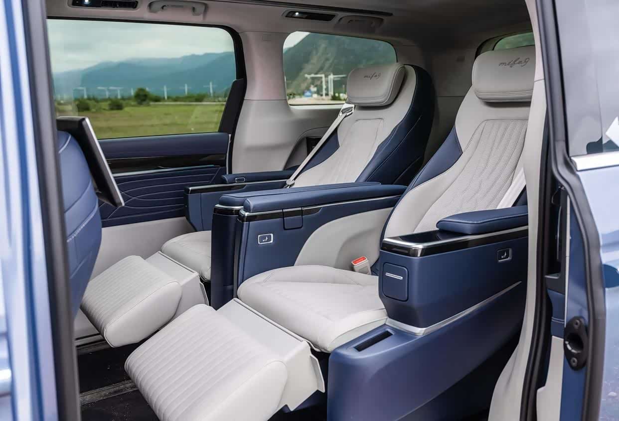 我们试驾的是“2+2+2”结构的6座车型,得益于优异的车身尺寸和大尺寸全景天窗,整个座舱宽敞又开阔。在一辆MPV最关键的第二排上,MIFA9配备了宽大舒适的两个独立座椅,并将规格拉满,电动调节、按摩、加热、通风、腿托、头枕等,只要是我们能想到的配置它几乎都配备了。