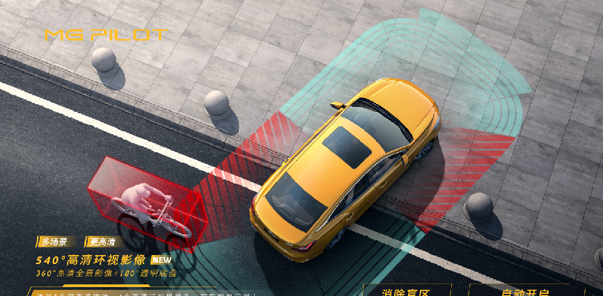 安全方面,全新MG5新增了透明底盘功能,同时将360°高清全景影像系统升级为540°的高清环视影像,该功能可通过3个超声波雷达、4个高清环视摄像头,让驾驶者全方位消除视线盲区。
