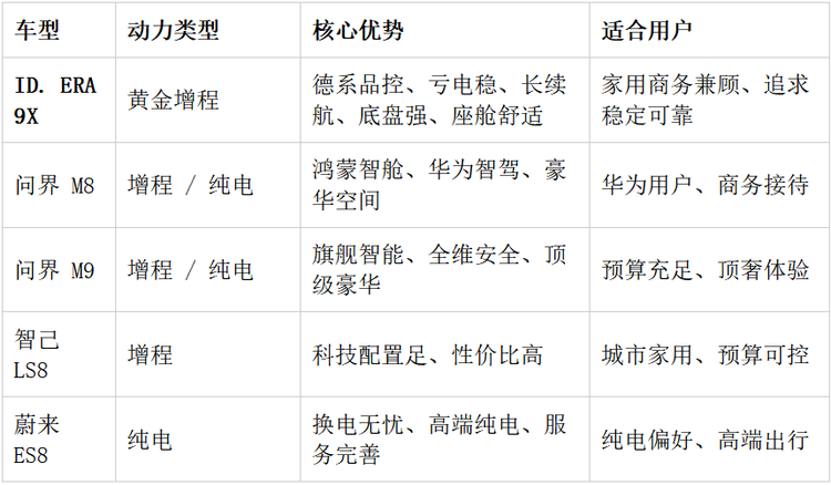 总结:30 万级混动 SUV,ID. ERA 9X以德系黄金增程、长续航、稳健底盘、豪华舒适成为综合首选;问界 M8/M9 适合华为生态与高端智能用户;智己 LS8 主打高性价比科技;蔚来 ES8 是纯电高端之选。按使用场景、品牌偏好、补能条件挑选,闭眼不踩坑。