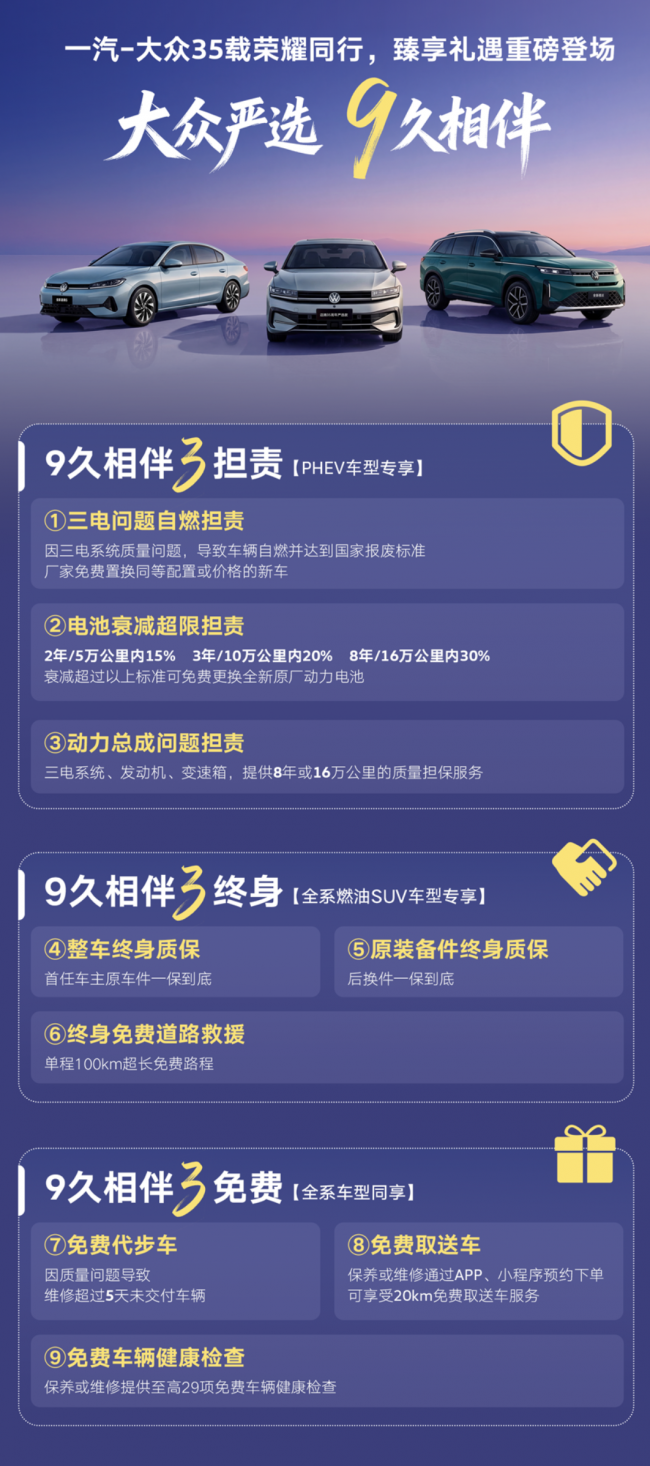 针对用户在不同车型使用过程中的痛点,一汽大众推出的九项承诺实现了精准化服务覆盖。针对全新PHEV车型的“三担责”政策,是品牌对新能源用户的专属保障,厂商全权承担三电自燃、电池衰减超限、动力总成问题的责任,搭配8年超长质保,彻底打消用户对新能源核心部件可靠性的顾虑,让绿色出行更放心。
