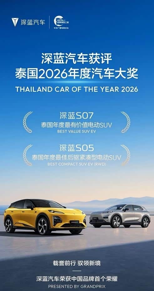 目前,深蓝已覆盖全球约100个国家和地区,包括东南亚、欧洲、中东、非洲、中南美洲等,并且在海外市场口碑良好。举个例子,S05和S07双双获得泰国2026年度汽车大奖,这是中国汽车品牌首次拿到这个奖项。泰国的汽车市场长期被日系品牌主导,深蓝能在这里拿到年度大奖,说明其产品力已经能够突破品牌认知的壁垒。