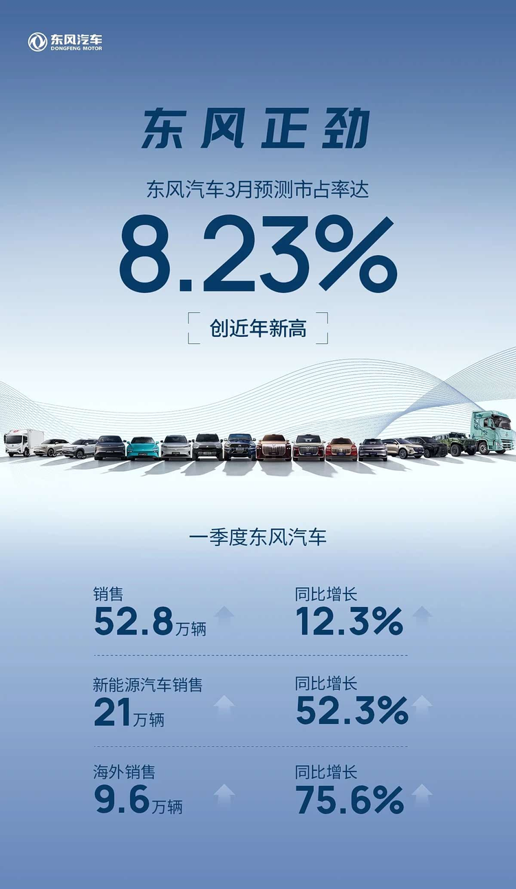 4月3日,东风汽车官方对外公布了一季度的销售数据,整体表现呈现稳步向好的态势。数据显示,一季度东风汽车累计销售汽车52.8万辆,较去年同期增长12.3%,这份成绩的背后,离不开各业务板块的协同发力。其中,新能源汽车成为增长主力,一季度销售21万辆,同比增长52.3%,不难看出,东风汽车在新能源领域的布局正在逐步落地见效。海外市场同样表现亮眼,一季度海外销售9.6万辆,同比增长75.6%,海外市场的拓展步伐持续加快,为整体销量增长注入了新的动力。值得一提的是,东风汽车3月市占率达到8.23%,创下近年新高,旗下各自主品牌齐头并进,岚图、猛士、奕派科技等品牌均有不错的交付表现,形成了多点开花的良好格局。