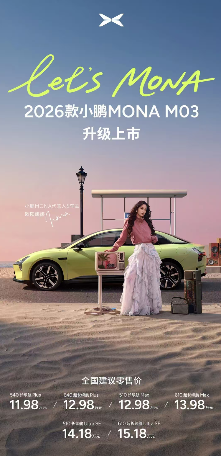 【新车上市】日前,2026款 小鹏MONA M03(参数|询价)正式上市,新车共推出6款车型,售价区间为11.98-15.18万元。作为年度改款车型,新车在内外细节、配色、智能座舱、智驾以及三电系统等方面都进行了升级。