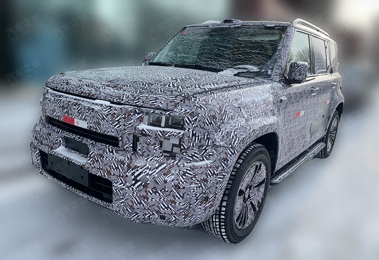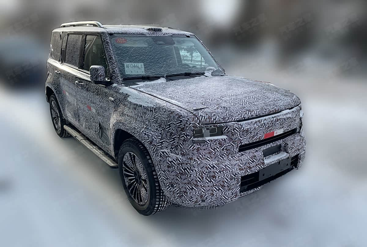 最引人注目的便是其整体轮廓。新车采用了鲜明的“方盒子”造型,这种设计语言直接传递出硬朗的视觉气息。车头部分,矩形的前大灯组轮廓清晰,格栅区域呈现出半封闭式的状态,下方则是非常厚重饱满的前包围。值得注意的是,在车顶的中央位置,能够看到一个明显的激光雷达装置,同时在侧翼子板处也设有摄像头。这些传感器的存在,通常意味着车辆将具备一套能力较强的驾驶辅助系统。