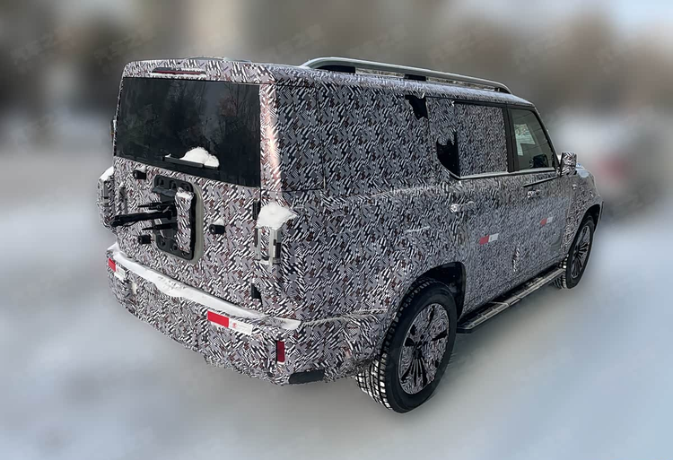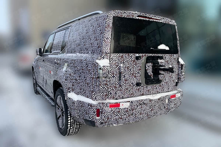 转到侧面,整车的体量感显得颇为突出。固定式的侧踏板和传统的门把手设计,与其硬派的风格相符。通过目测对比,这款车的长度很可能突破5米,而车宽预计也接近2米的范围,这保证了车内能够拥有充裕的空间基础。车尾部分的设计同样延续了硬朗的主题。尾门中央预留了外挂备胎的固定接口,结合门把手的位置来判断,它应该会采用侧开式的尾门结构,这种设计在强调功能性的车型上比较常见。