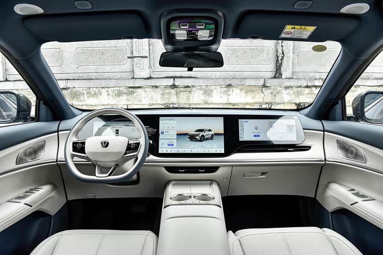 内饰方面提供多种双拼色可选,包括方向盘也采用双拼皮革包裹,确实能为车内提升豪华感,除此之外,前排的三块大屏幕视觉冲击力也很强,表面用一整块玻璃覆盖,为了能在强光情况下看清屏幕的内容,对三块屏幕都提升了亮度,14.6英寸中控屏幕支持手机互联和语音交互功能,能够满足日常使用的需求。