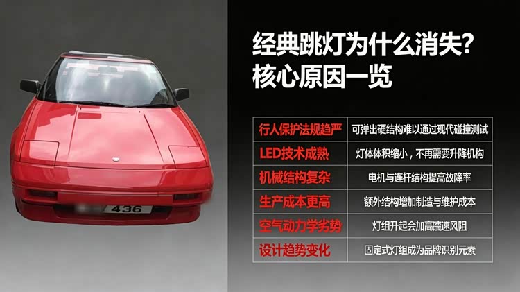 1936年,隐藏式大灯技术诞生,代表车型为Cord810,那时候只是萌芽期,真正的爆发期是从60年代开始,八九十年代拿到了巅峰。跳灯之所以在这个阶段崛起,核心的核心是因为跑车,为了操控好,跑车设计的又低又矮,车头比较尖,这样可以降低风阻系数,为了追求极致的风阻系数,很多超跑开始使用跳灯,如法拉利F40、兰博基尼康塔什等,在关闭大灯的情况下,跳灯的确可以降低风阻系数,关键还炫酷。