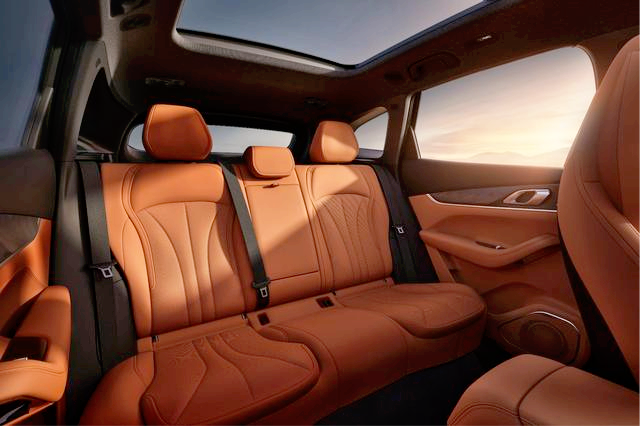 进入车内,这次给到了惊喜了,一眼看去大面积软包,生态木纹饰板,水晶组件,再配上双色搭配,整个档次感明显比L7提升了不少。前方悬浮中控屏加上全液晶仪表,这些实用配置都有Flyme Auto车机系统,流畅度也是没问题。其次256色氛围灯、座椅通风加热按摩,主驾记忆、50瓦无线快充、23扬声器带头枕音响,全景天窗基本全给你配备齐全了。