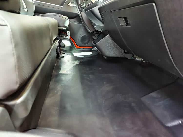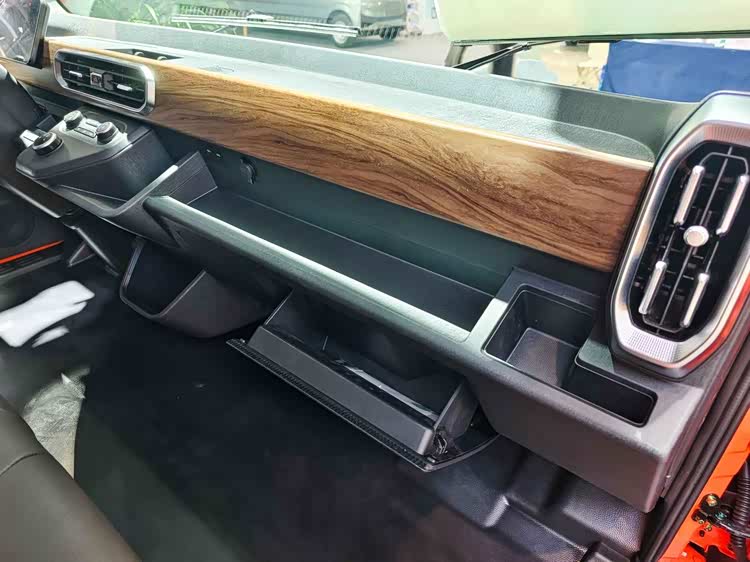 驾驶室内可坐3人,中央座椅靠背可翻下,用作储物格和杯架。