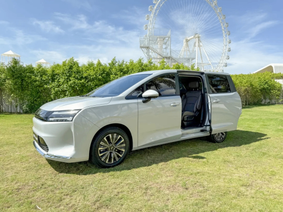 续航方面,CLTC工况415-510km,支持快充,1小时左右能充到80%。外观看着也挺大气,开出去不丢面子。但问题在于,它的后悬架和菱智新能源一样,是钢板弹簧非独立悬架,和属于商用车的底盘设定。拉货没问题,但家用的话后排颠簸感明显,过坑过坎的时候能感觉出来。另外,这车只有单侧手动滑门,不是双侧电滑门。动力方面,电机功率只有90kW,拉这么大个车,起步和超车会有点肉。