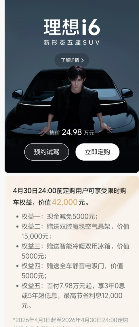 对消费者来说,4 月无疑是分期购买理想 i6 的优质窗口期,三年免息能实实在在节省近万元成本。而已经订车未提车的用户,则因政策节奏问题错失福利,难免产生心理落差。整体来看,此次政策在刺激销量的同时,也再次体现出新能源汽车市场政策变动快、购车时机对成本影响显著的特点。